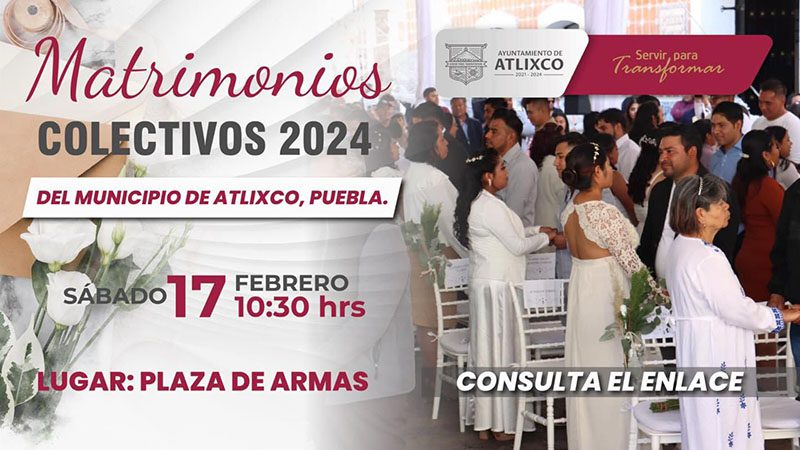 El Ayuntamiento de Atlixco, a través del Registro Civil Municipal y en coordinación con el Registro Civil del Estado de Puebla, llevará a cabo la campaña gratuita de “Matrimonios Colectivos 2024”, el próximo 17 de febrero en Plaza de Armas de la ciudad, dio a conocer la alcaldesa, Ariadna Ayala Camarillo.