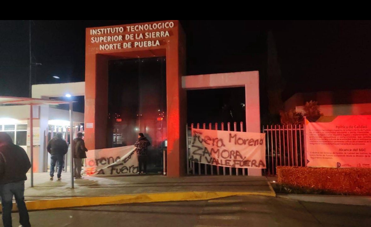 La noche de este martes, estudiantes del Instituto Tecnológico Superior de la Sierra Norte de Zacatlán tomaron las instalaciones del plantel como acto de protesta, cerrando con cadenas la entrada principal y colocando mantas con consignas que reflejan su inconformidad ante diversas problemáticas.