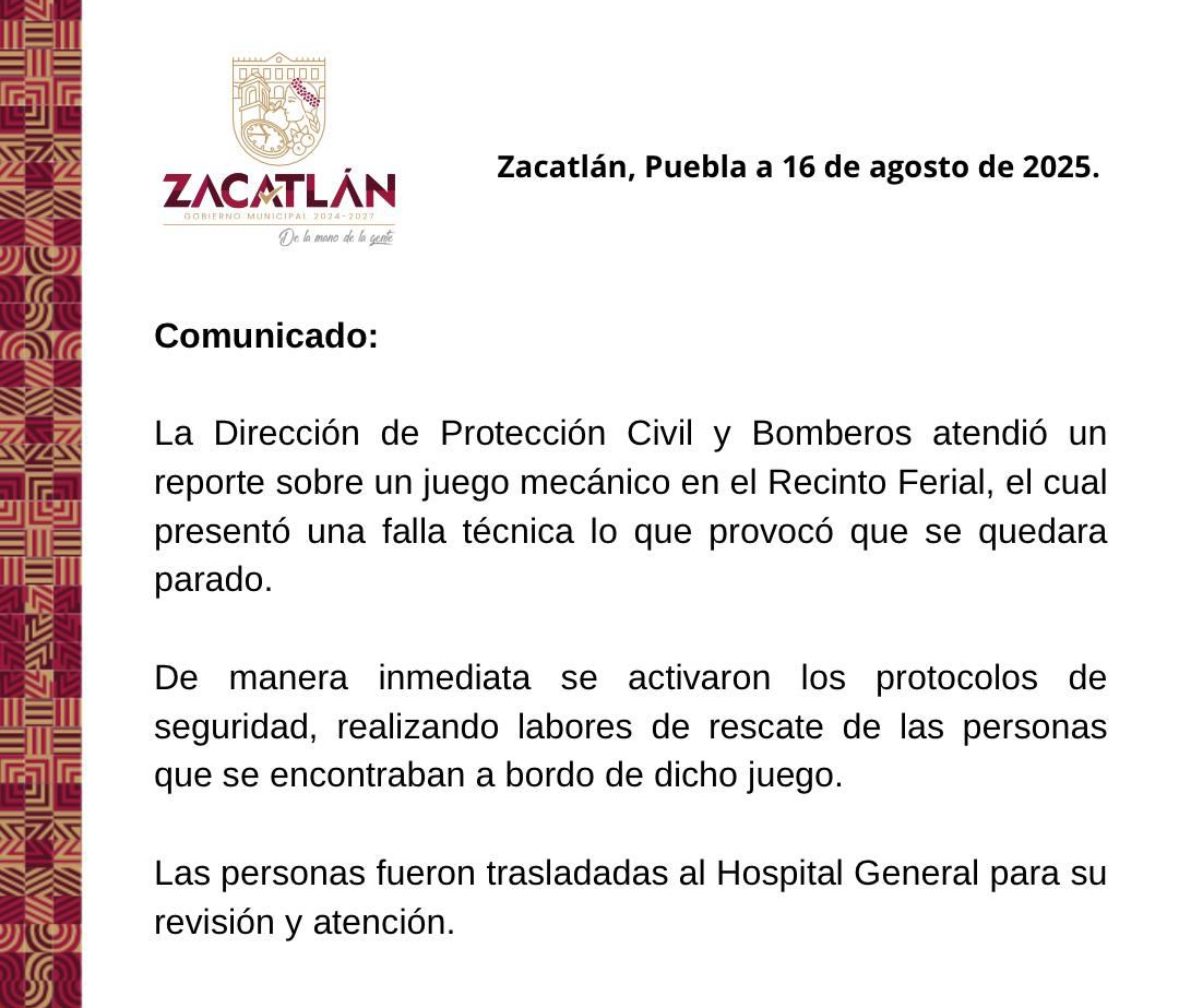 Un juego mecánico en el Recinto Ferial de Zacatlán presentó una falla técnica la noche de hoy, lo que causó que se detuviera abruptamente, dejando a varias personas atrapadas en lo alto de la estructura.