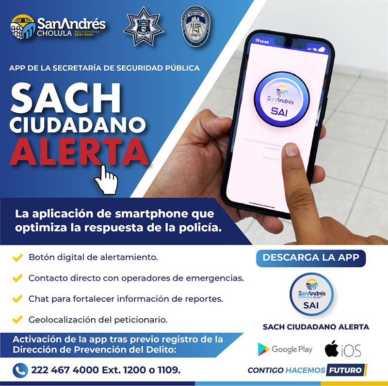 Con el objetivo de acercar los servicios de la policía a las y los sanandreseños, así como reducir los tiempos de respuesta en los llamados de emergencia, la Secretaría de Seguridad Pública y Protección Ciudadana (SSPPC) de San Andrés Cholula, informa que se encuentra disponible la aplicación para smartphone “SACH Ciudadano Alerta”.