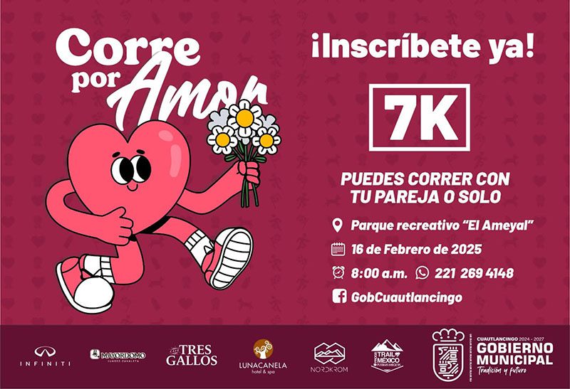El Gobierno Municipal de Cuautlancingo invita a la ciudadanía a participar en el evento deportivo, “Corriendo por amor”, que se llevará a cabo el 16 de Febrero en el Parque Recreativo El Ameyal en punto de las 8:00 A.M.