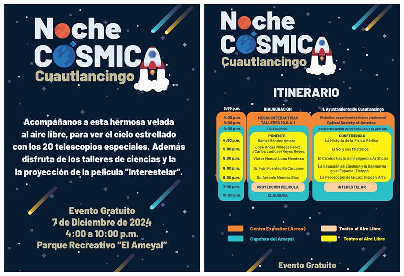 La Dirección de Economía y Turismo de Cuautlancingo invita a la ciudadanía a asistir a la “Noche cósmica,” éste sábado 07 de Diciembre en el Parque Recreativo “El Ameyal”, donde las familias podrán disfrutar de diversas actividades para chicos y grandes con un horario de 4:00 P.M. a 10:00 P.M.