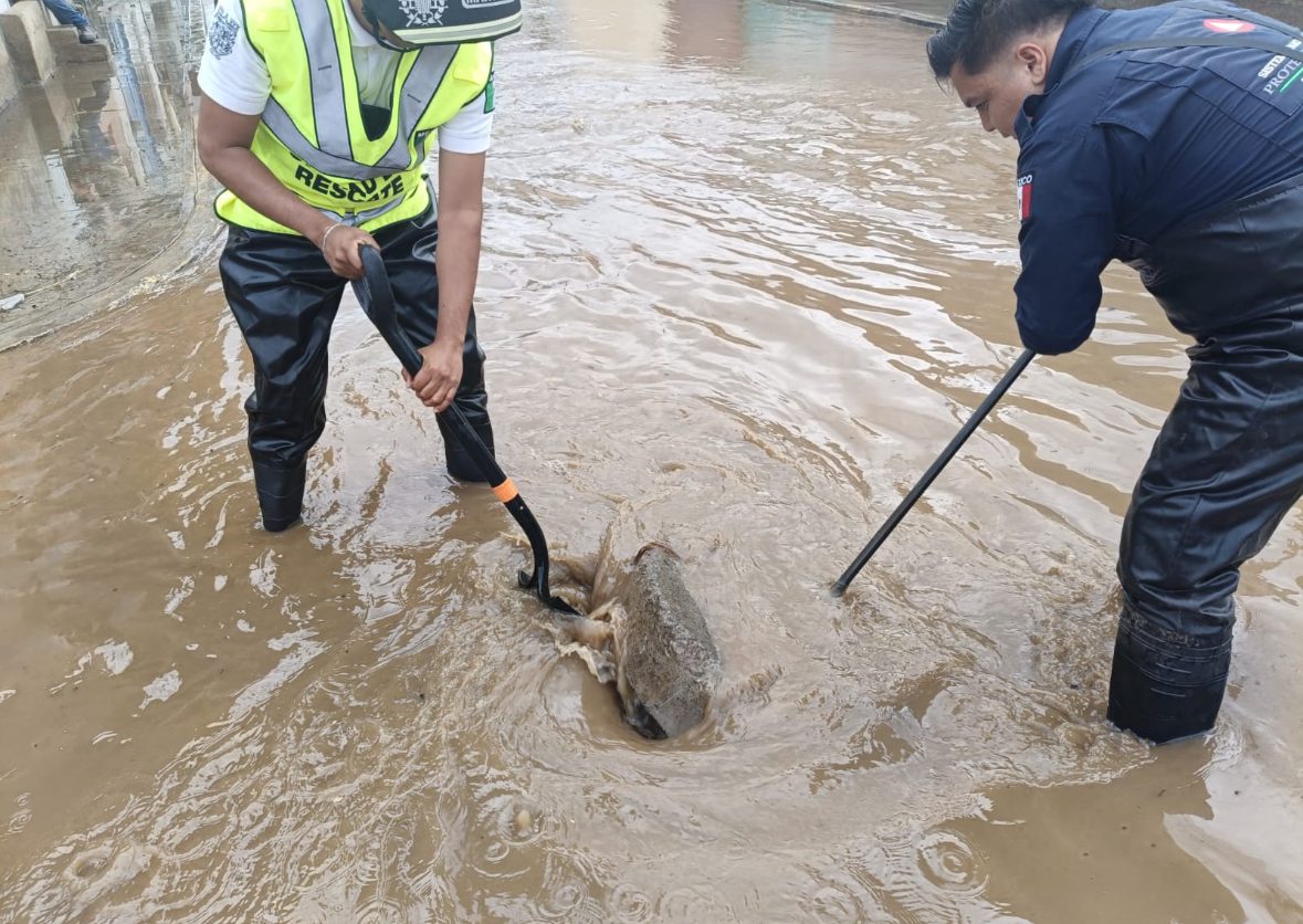 Asimismo, brigadas de Protección Civil abrieron pozos de visita en la calle 5 Norte, permitiendo el desfogue del agua, mientras que cuadrillas de limpia realizaron la limpieza de rejillas y bocas de tormenta en la zona de la 2 Norte a la 7 Norte y de la 24 Poniente a la 16 Poniente.