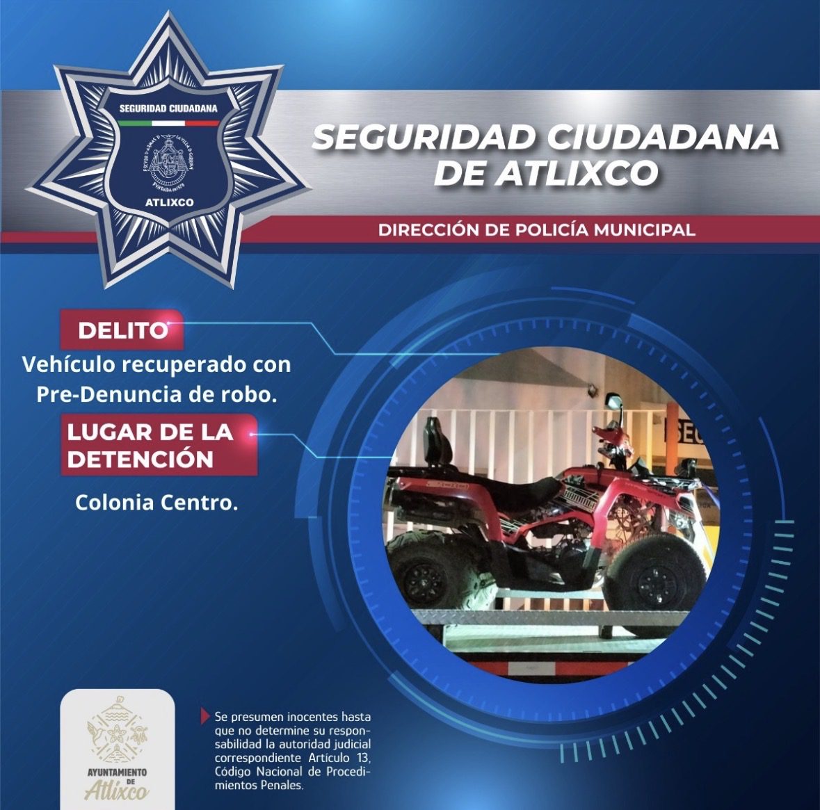 La Secretaría de Seguridad Ciudadana de Atlixco recuperó una cuatrimoto con predenuncia de robo en la colonia Centro, tras recibir un reporte acerca del robo de una Cuatrimoto marca Veloci, Tipo: HAMMER KX FORCE, color rojo con negro, año 2025, ante esto se realizaron recorridos de búsqueda y localización en calles aledañas, siendo en la calle 2 Sur, donde se localiza una unidad con características coincidentes.