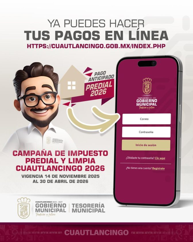 Las formas de pago pueden ser en las cajas de la Presidencia Municipal o en línea a través del portal: https://cuautlancingo.gob.mx/index.php