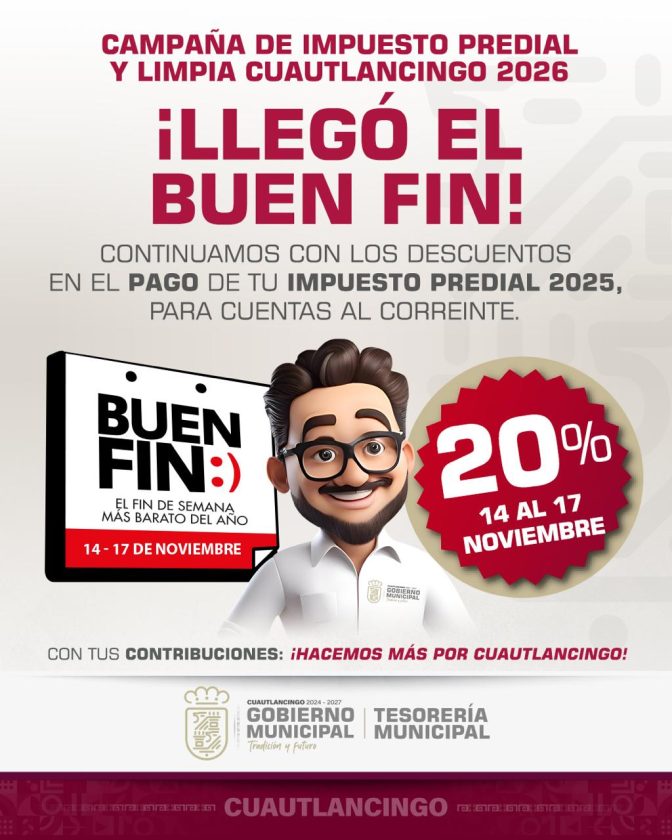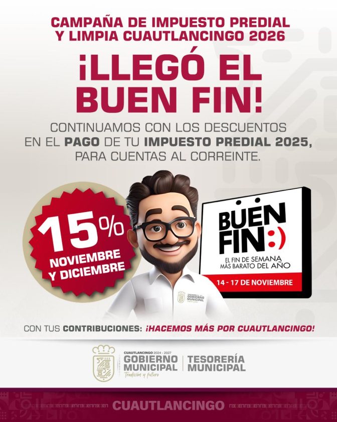 Con el objetivo de apoyar la economía de las familias en Cuautlancingo, el gobierno municipal informa los descuentos que se aplicarán en el pago del impuesto predial y de limpia desde el 14 de noviembre de 2025 hasta el 30 de abril de 2026.