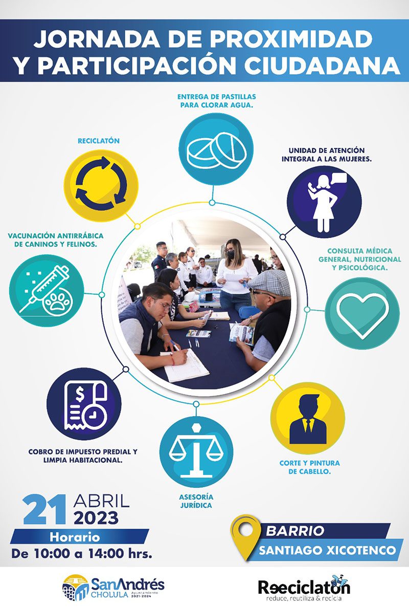 Este viernes 21 de abril, el Barrio de Santiago Xicotenco de la Cabecera Municipal, recibirá la Jornada de Proximidad y Participación Ciudadana del Ayuntamiento de San Andrés Cholula, en su plazuela ubicada en la Av. Maximino Ávila Camacho y Calle 8 norte, de 10:00 a 14:00 horas.