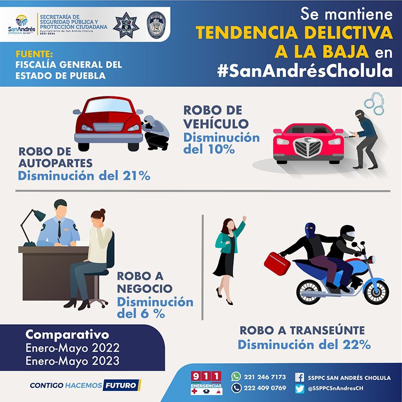 Como resultado de la implementación de acciones en materia de prevención, la Secretaría de Seguridad Pública y Protección Ciudadana (SSPPC) de San Andrés Cholula, informó que, durante los primeros cinco meses de 2023 en comparación con el mismo periodo del año anterior, el municipio registró una reducción en la incidencia delictiva en diversos delitos.