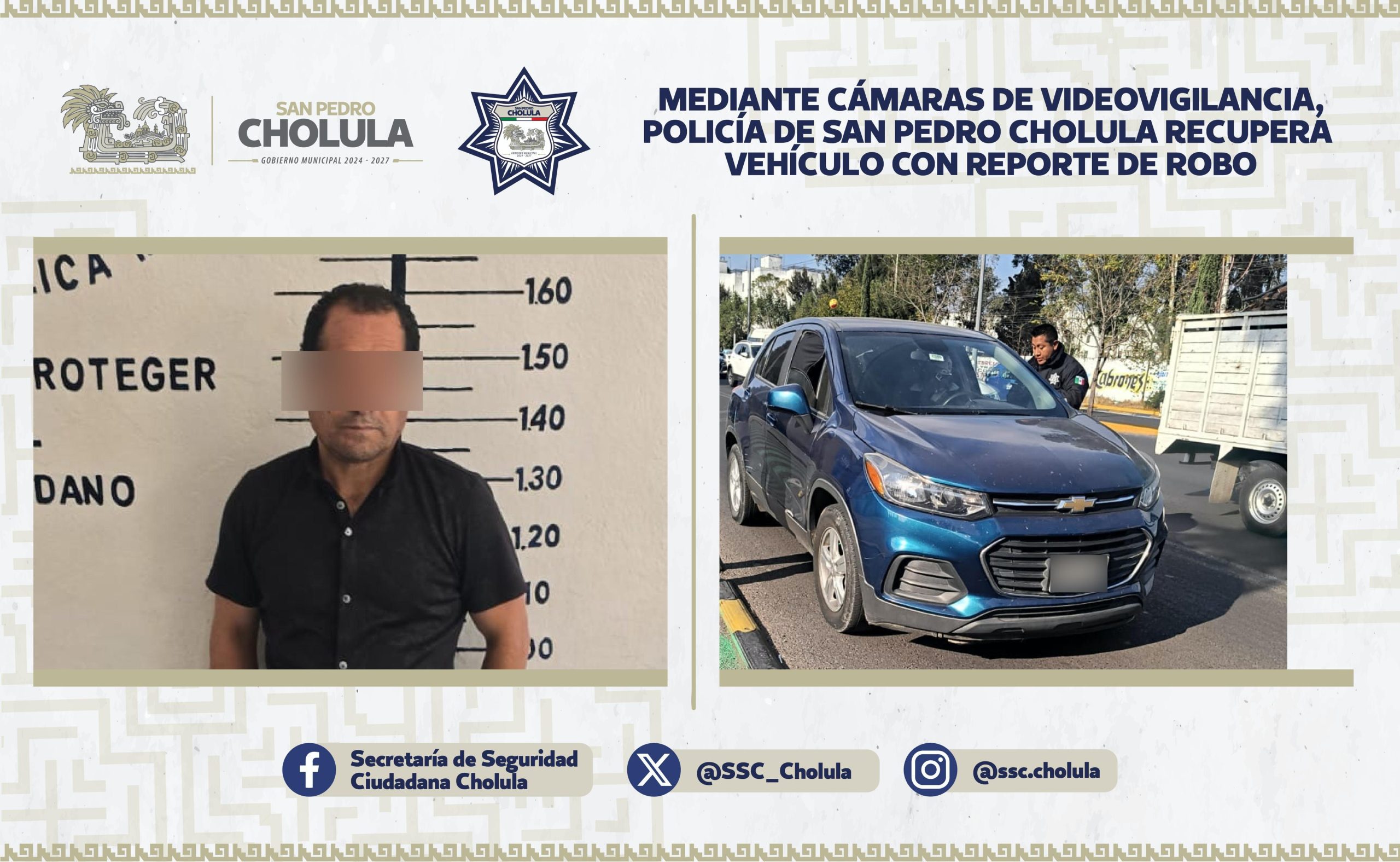 Derivado de las acciones coordinadas entre el Gobierno del Estado de Puebla y la Secretaría de Seguridad Ciudadana de San Pedro Cholula (SSC Cholula), fue detenido José Raúl “N”, de 40 años de edad, quien conducía un vehículo con reporte de robo vigente.