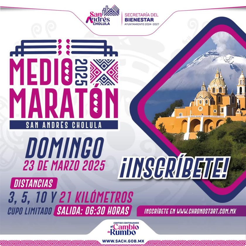 Como parte de las actividades programadas, el Medio Maratón de San Andrés Cholula permitirá a las y los corredores competir por las calles y la zona arqueológica del municipio, promoviendo el deporte y la sana convivencia familiar. La competencia, avalada por la Asociación Poblana de Atletismo, iniciará a las 6:30 horas, con salida y meta en el Parque de las 7 Culturas. Habrá recorridos de 3, 5, 10 y 21 kilómetros, y se otorgarán premios de entre 2,000 y 15,000 pesos a los cinco primeros lugares de cada categoría en ambas ramas, además de un reconocimiento especial para los mejores corredores sanandreseños.