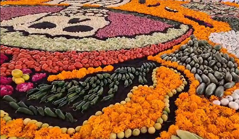Más de dos toneladas de hortalizas y flores se usaron para esta catrina de 10 x 7 metros