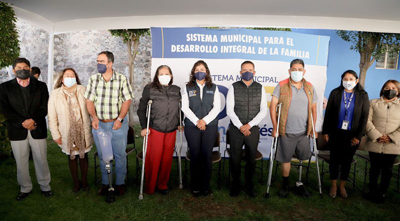 El edil Mundo Tlatehui y Lupita Cuautle, presidenta del Sistema Municipal para el Desarrollo Integral de la Familia (SMDIF), encabezaron en las instalaciones del organismo la entrega de 5 prótesis y 6 órtesis con valor de 628 mil pesos.