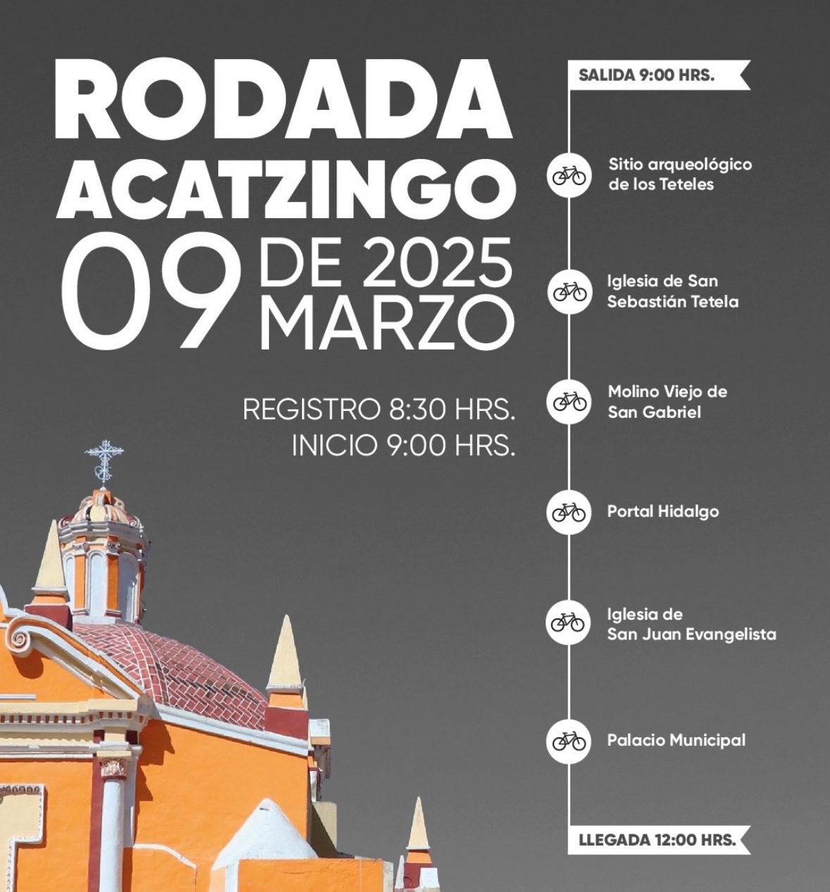 Se informa que en el municipio de Acatzingo, se llevará a cabo una rodada en bicicleta para visitar y conocer la historia de seis sitios de interés cultural de dicho municipio, a la cual podrá sumarse el público en general el próximo domingo 9 de marzo.