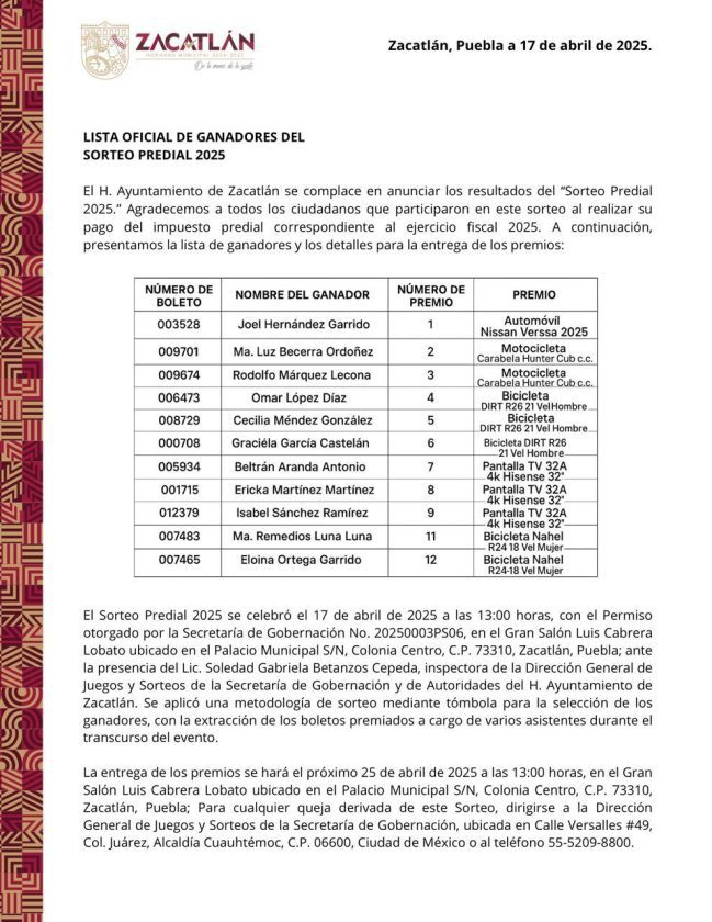 El número de permiso fue el 20250003PS06 y se repartieron 12 premios desde un auto último modelo marca Nissan, hasta motocicletas, pantallas y bicicletas. Los ganadores fueron los siguientes: