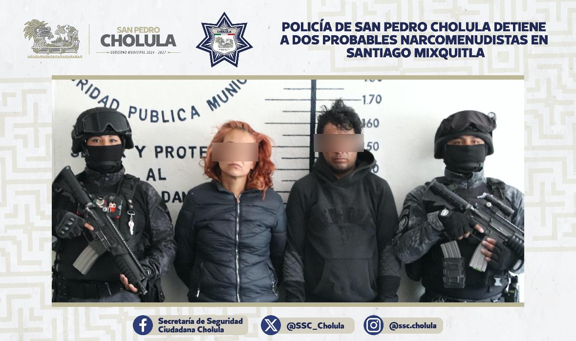 Como parte de las acciones operativas implementadas por la Secretaría de Seguridad Ciudadana de San Pedro Cholula (SSC Cholula), se logró la detención de María Guadalupe “N”, de 29 años, y Edgar “N”, de 38 años, por su probable responsabilidad en la comisión de delitos contra la salud, en su modalidad de narcomenudeo, en el Barrio de Santiago Mixquitla.