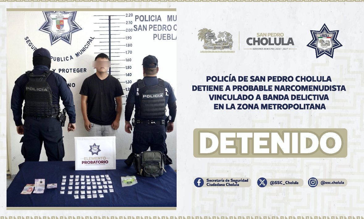 Como resultado de las labores de inteligencia y vigilancia estratégica que implementa la Secretaría de Seguridad Ciudadana de San Pedro Cholula (SSC Cholula) a través del Operativo Junta Auxiliar Segura, se logró la detención de Alan “N”, de 20 años de edad, señalado como probable integrante de una banda dedicada a actividades ilícitas como narcomenudeo, delitos contra la salud, robo a negocios y robo de vehículos.