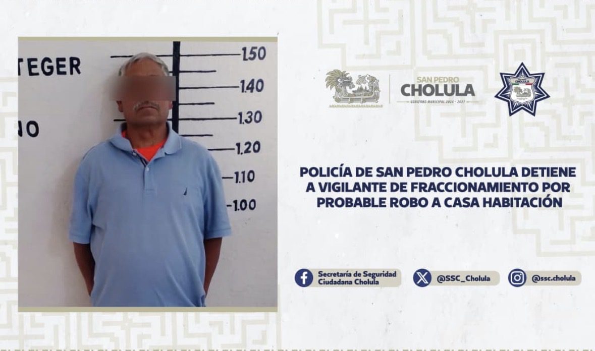 Elementos de la Secretaría de Seguridad Ciudadana de San Pedro Cholula (SSC Cholula) detuvieron a Julián “N”, de 56 años de edad, por su probable participación en el delito de robo a casa habitación, ocurrido en un inmueble ubicado sobre la carretera estatal a Coronango, al interior del Fraccionamiento San Joaquín, conocido como San Diego Los Sauces.