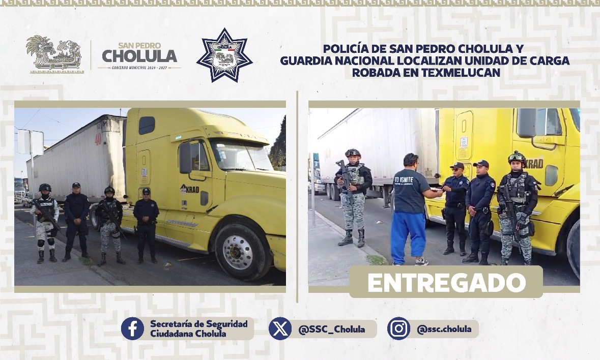 Como resultado de la coordinación interinstitucional y de la aplicación de protocolos de reacción inmediata, elementos de la Secretaría de Seguridad Ciudadana de San Pedro Cholula, en conjunto con la Guardia Nacional, localizaron un tractocamión y su caja con mercancía, relacionados con un reporte emitido en el municipio de San Martín Texmelucan.