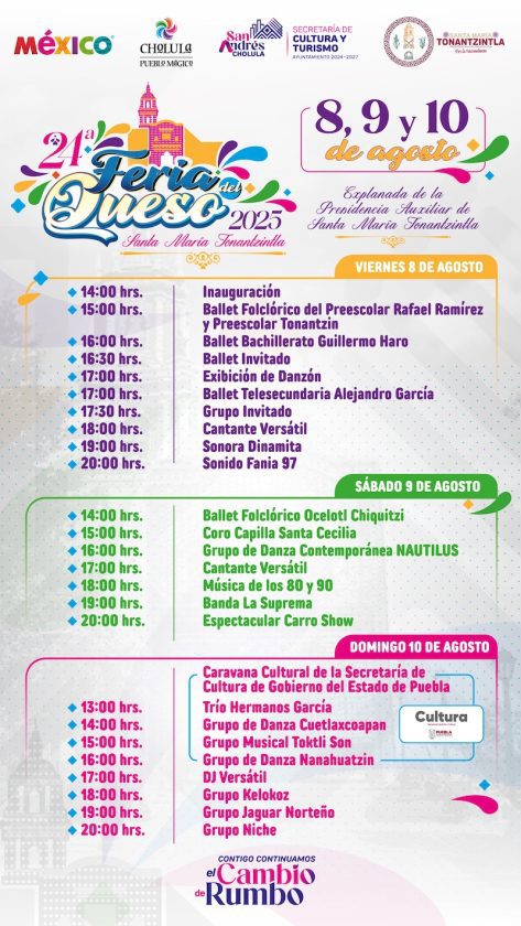 Por su parte, Eva María Toxqui Daniel, secretaria de Cultura y Turismo, dio a conocer el programa de actividades culturales y artísticas, resaltando una cartelera diversa para toda la familia. El 8 de agosto se llevará a cabo la inauguración oficial a las 14:00 horas, seguida de la presentación estelar del grupo de música tropical la Sonora Dinamita a las 19:00 horas y del Sonido Fania 97 a las 20:00 horas. Para el 9 de agosto, el programa contempla la participación del Ballet Folclórico Ocelotl Chiquitzi a las 14:00 horas, el Coro Capilla Santa Cecilia a las 15:00 horas, cerrando con la Banda La Suprema a las 19:00 horas.