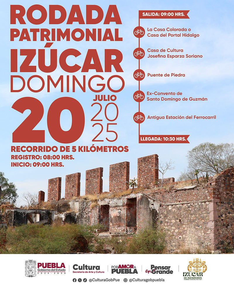 En cercanía con las y los habitantes de la Mixteca Poblana, el gobierno encabezado por Alejandro Armenta, a través de la Secretaría de Arte y Cultura, realizará una Rodada Patrimonial en Izúcar de Matamoros, cuyo trayecto será de 5 kilómetros y contempla la visita y explicación histórica de cinco sitios emblemáticos del municipio.