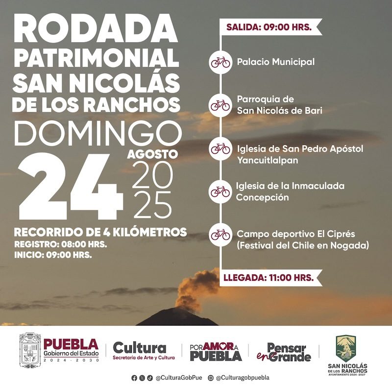 Este domingo 24 de agosto, el gobierno estatal, a través de la Secretaría de Arte y Cultura, realizará una rodada patrimonial en San Nicolás de los Ranchos, enmarcada en el Festival Internacional del Chile en Nogada, un evento que promueve la gastronomía poblana en un entorno de paz para las y los visitantes del municipio.