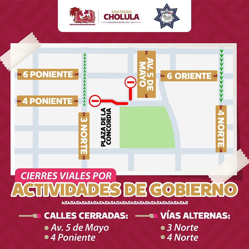 Derivado del inicio de obras de reencarpetamiento en la 12 Oriente-Poniente, a cargo del Gobierno del Estado encabezado por Alejandro Armenta, y del municipio de San Pedro Cholula, al frente de Tonantzin Fernández; la Secretaría de Seguridad Ciudadana (SSC Cholula) implementará dispositivos viales y se habilitarán vías alternas, con el fin de evitar molestias viales a la ciudadanía.