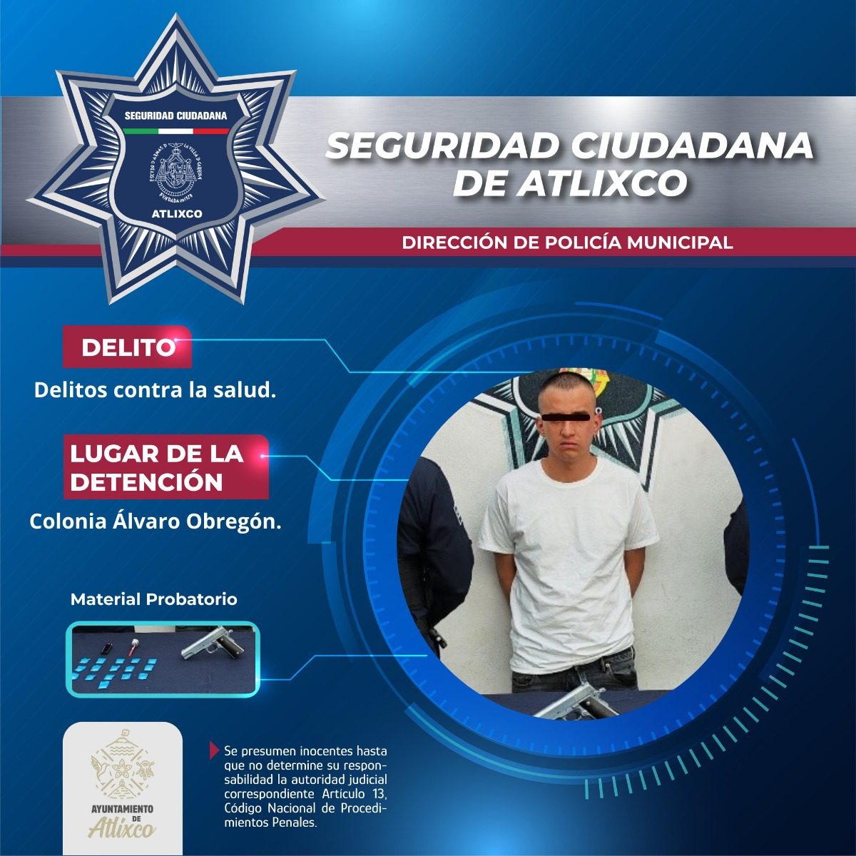 Elementos de la Secretaría de Seguridad Ciudadana de Atlixco detuvieron a un masculino en la colonia Álvaro Obregón por su probable participación en delitos contra la salud.