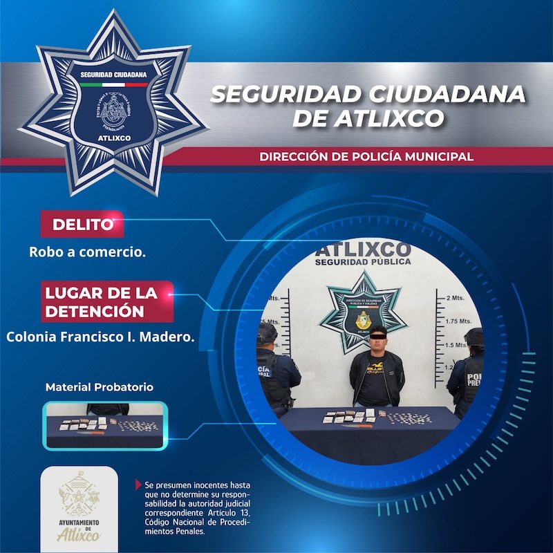 Elementos de la Policía de Atlixco detuvieron a un masculino por su probable responsabilidad en el delito de robo a comercio, tras un reporte ciudadano en la colonia Francisco I. Madero.