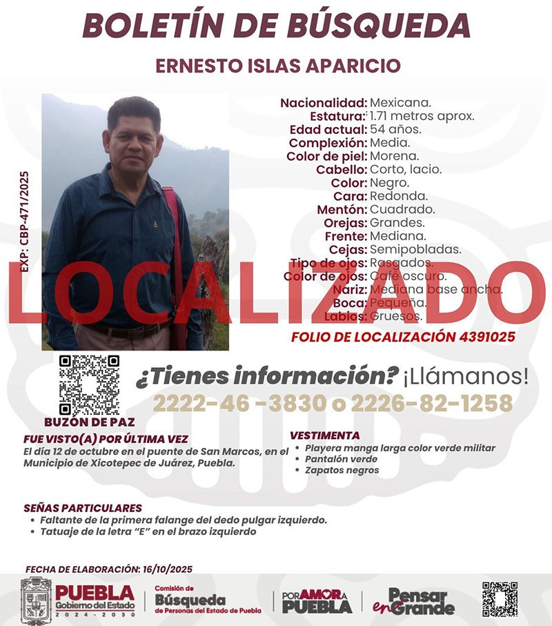Personal de la Comisión de Búsqueda de Personas del Estado de Puebla, localizó sin vida a Ernesto Islas Aparicio, de 54 años de edad, en el río San Marcos, a la altura de la comunidad de Hula, perteneciente al municipio de Tlacuilotepec.