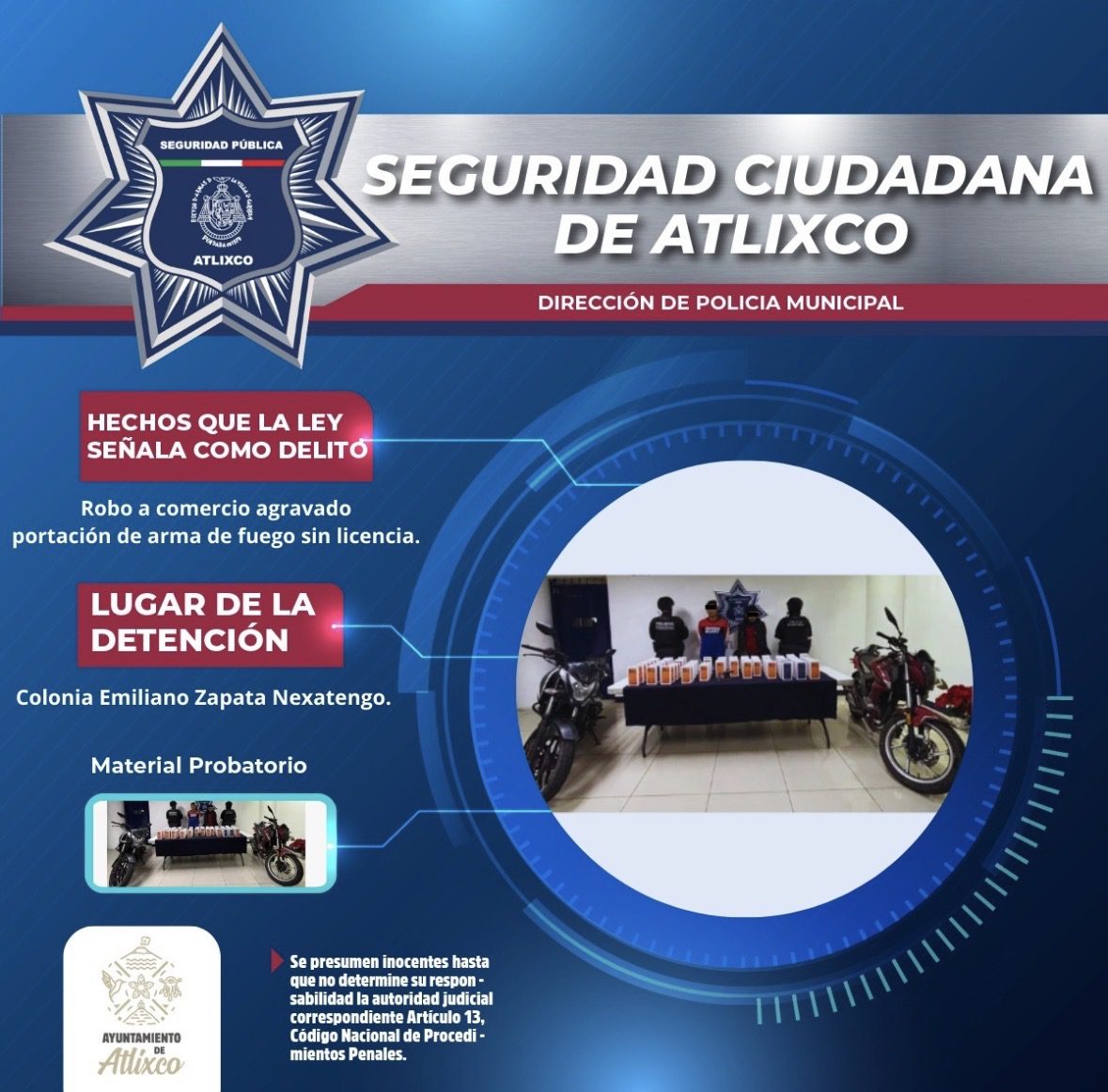 La Secretaría de Seguridad Ciudadana de Atlixco informó que, la noche del 22 de diciembre de 2025, se logró la detención de dos personas presuntamente relacionadas con un robo a comercio registrado en una tienda de telefonía celular al interior de Plaza Moraleda.