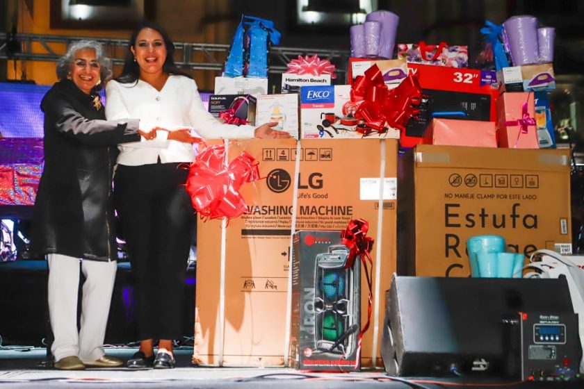 Como parte del evento, la presidenta municipal encabezó una rifa de atractivos premios, que incluyeron pantallas, lavadoras, estufas, vajillas y regalos sorpresa, todos sorteados mediante una tómbola.