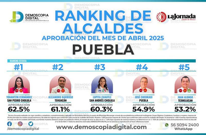 A casi siete meses de haber iniciado su administración, Fernández logró un sólido 62.5% de aprobación por parte de los cholultecas, superando incluso su desempeño en la medición anterior de marzo. Este respaldo ciudadano la coloca en el primer lugar del listado, seguida por Alejandro Barroso (Tehuacán), Lupita Cuautle (San Andrés Cholula), José Chedraui (Puebla capital) y Juan Alonso (San Martín Texmelucan).
