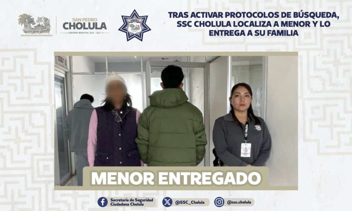 Policías Municipales de la Secretaría de Seguridad Ciudadana (SSC Cholula) localizaron a un menor reportado como desaparecido, luego de activar de manera inmediata los protocolos de búsqueda en San Pedro Cholula.