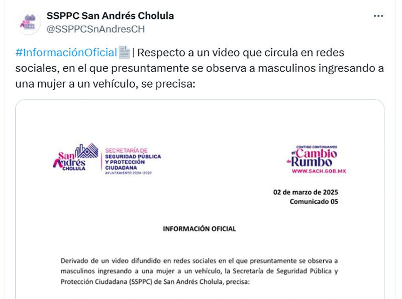 Derivado de un video difundido en redes sociales en el que presuntamente se observa a masculinos ingresando a una mujer a un vehículo, la Secretaría de Seguridad Pública y Protección Ciudadana (SSPPC) de San Andrés Cholula, precisa que, al momento de tomar conocimiento de este reporte, de inmediato se activó el protocolo de búsqueda, dando como resultado la ubicación del vehículo y los masculinos.
