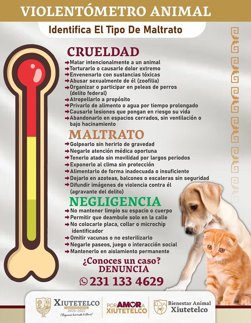 Con el compromiso de fomentar una cultura de respeto y cuidado hacia los seres sintientes, el Ayuntamiento de Xiutetelco, que encabeza el presidente municipal Baltazar Narciso Baltazar, presentó el Violentómetro Animal, una herramienta gráfica que permite identificar los diferentes tipos de maltrato a las mascotas y otros animales.