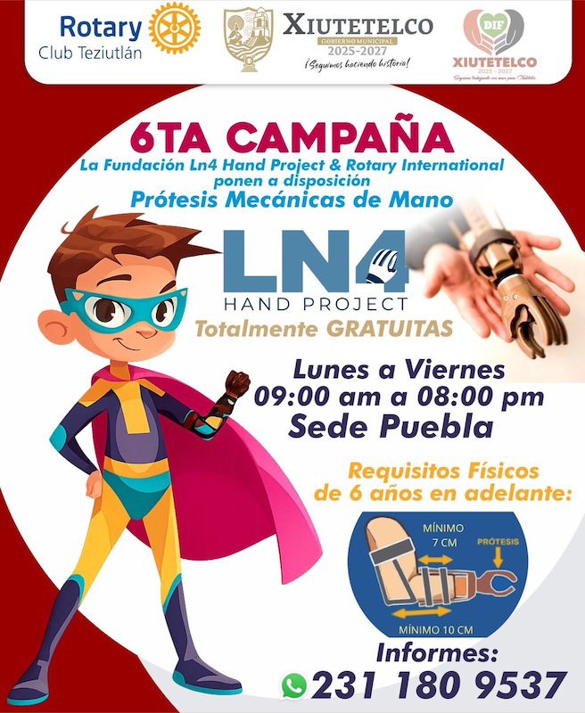 El Gobierno Municipal de Xiutetelco, encabezado por el presidente municipal, Ing. Baltazar Narciso Baltazar, anunció la puesta en marcha de la 6ª Campaña de Entrega de Prótesis Mecánicas de Mano, gracias a una alianza estratégica con la Fundación internacional Ln4 Hand Project y Rotary International, organizaciones reconocidas a nivel mundial por su labor humanitaria e innovadora.
