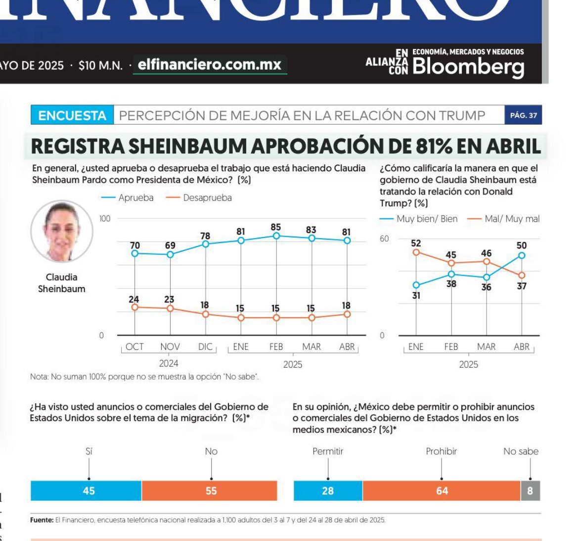 La presidenta Claudia Sheinbaum obtuvo un nivel de aprobación ciudadana de 81% en el mes de abril, según revela la más reciente encuesta nacional de El Financiero, realizada a mil 100 personas adultas.