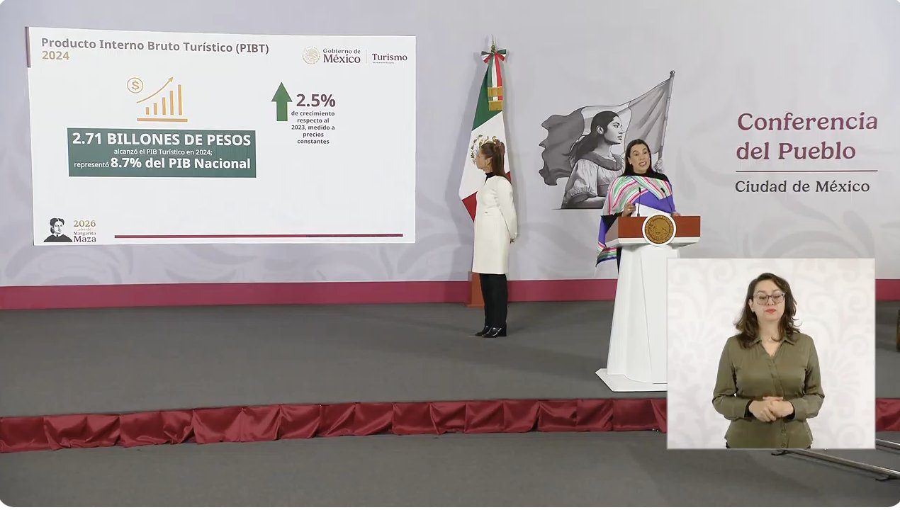 Detalló que se alcanzaron 2.71 billones de pesos del Producto Interno Bruto Turístico (PIBT), alcanzando el registrado en 2024 y representando el 8.7 por ciento del PIB Nacional; además la Inversión Extranjera Directa Turística (IEDT), durante el tercer trimestre de 2025 fue de 787.6 millones de dólares (mdd), esto representa un crecimiento del 40.3 por ciento respecto a 2024, destacando la inversión en departamentos y casas con servicios de hotelería, así como hoteles con otros servicios integrados. También el empleo turístico tuvo un crecimiento con 5 millones de puestos de trabajo, por lo que uno de cada 10 empleos a nivel nacional corresponde al turismo y en noviembre de 2025 se registró un crecimiento del 4.9 por ciento en el número de trabajadores asegurados en el sector.