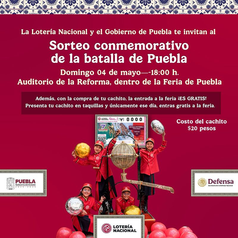 Este esfuerzo conjunto entre el Gobierno del Estado, la Secretaría de la Defensa Nacional (SEDENA) y la Lotería Nacional busca honrar la gesta heroica del 5 de mayo de 1862 y, al mismo tiempo, brindar a las y los poblanos una experiencia cultural y patriótica única, donde podrán presenciar en vivo a los emblemáticos Niños Gritones, la tradicional esfera, los ábacos y toda la tradición que caracteriza a este histórico sorteo.