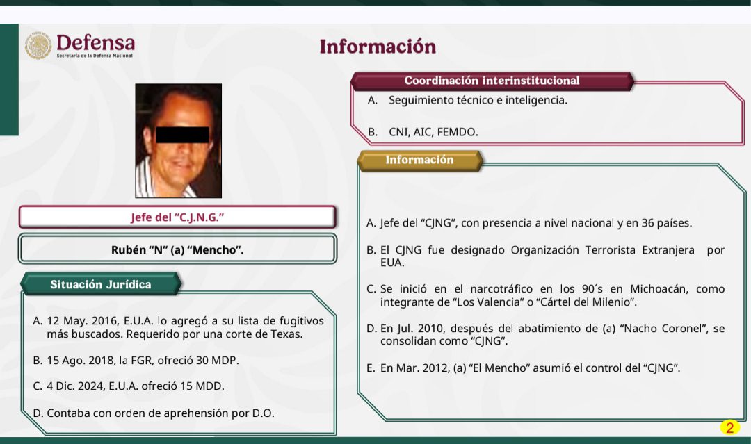 Con trabajos de inteligencia militar central, del Centro Nacional de Inteligencia y de la Fiscalía General de República (FEMDO), Fuerzas Especiales del Ejército Mexicano planearon y ejecutaron una operación en Tapalpa, Jalisco, en la que intervinieron diversas aeronaves de la Fuerza Aérea y la Fuerza Especial de Reacción Inmediata de la Guardia Nacional para lograr la detención de Ruben «N» (a) Mencho.
