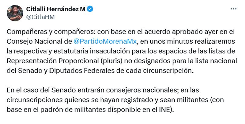 La secretaria general de Morena, Citlalli Hernández, dio a conocer la lista de las personas inscritas para contender en el proceso de insaculación para senadores y diputados del partido.