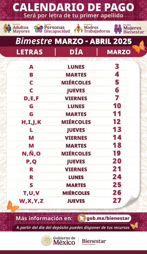 Señaló que, para brindar mejor atención, el depósito bancario se realiza de acuerdo con la letra del primer apellido del derechohabiente, bajo el siguiente calendario: