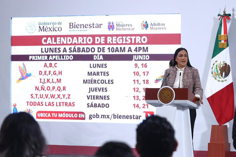 La secretaria de Bienestar, Ariadna Montiel Reyes, informó que, del 9 al 21 de junio, se realiza en todo el país el registro a las Pensiones Mujeres Bienestar y para el Bienestar de las Personas Adultas Mayores.