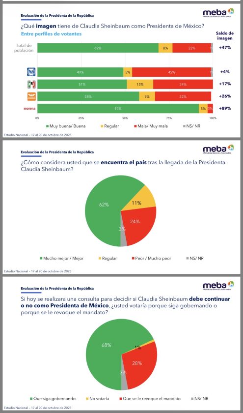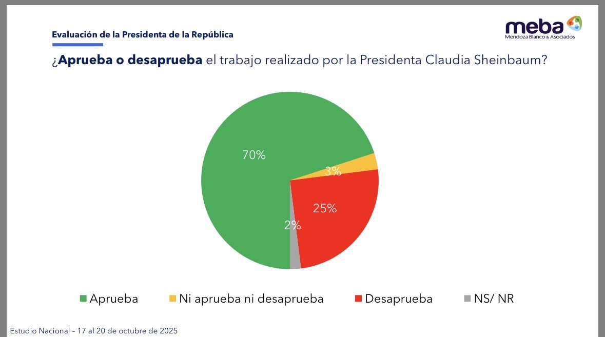 A más de año de su mandato, la presidenta de México, Claudia Sheinbaum Pardo, registra un alto nivel de aceptación entre la ciudadanía, con el 70 por ciento de los mexicanos avalando su gestión, según revela la más reciente encuesta nacional de la firma Mendoza Blanco y Asociados.