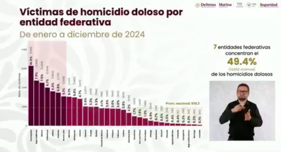 Destacó que el 49. 4 por ciento de las víctimas de homicidio doloso se concentran en siete entidades: Guanajuato (10.5%); Baja California (7.9%); Estado de México (7.5%); Chihuahua (6.7%);: Jalisco /6%); Guerrero (5.8%); Nuevo León (5.1%). Mientras que los delitos de alto impacto también tuvieron una reducción del 38 por ciento entre 2018 y 2024.