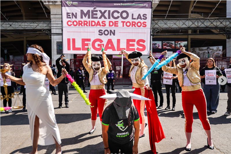 En el marco de su 10o Aniversario, la organización mexicana por la defensa animal ANIMAL HEROES, realizó una manifestación pacífica con un performance frente a la Plaza de Toros México, donde representaron cómo sugieren que un toro en una corrida ve a los toreros: como personajes terroríficos que solo lastiman y matan.