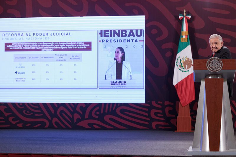 En conferencia de prensa matutina el mandatario explicó que “es evidente que se necesita una reforma en el Poder Judicial porque hay mucho influyentismo, corrupción, nepotismo, muchos vicios y se deja en libertad a delincuentes de cuello blanco y de la llamada delincuencia organizada si hay dinero de por medio. (…) Por eso no extraña que en las encuestas la gente esté a favor de que se lleve a cabo una elección de jueces, de magistrados, de ministros, la mayoría quiere eso”.