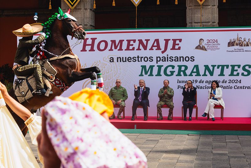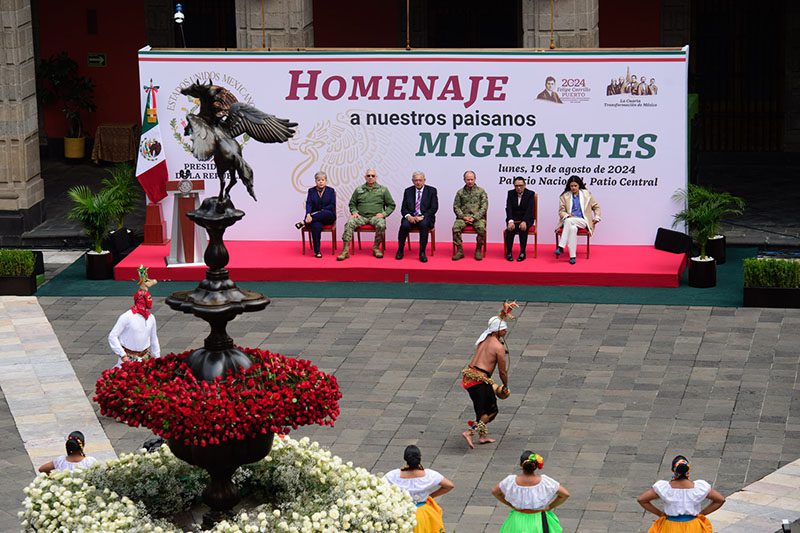 En el Patio Central de Palacio Nacional, el presidente López Obrador encabezó el homenaje a la población migrante mexicana, que consistió en un concierto de música regional acompañado de danzas tradicionales de entidades federativas que registran mayor presencia de connacionales en Estados Unidos.