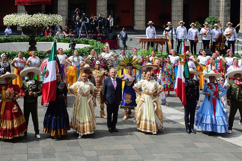 En el Patio Central de Palacio Nacional, el presidente López Obrador encabezó el homenaje a la población migrante mexicana, que consistió en un concierto de música regional acompañado de danzas tradicionales de entidades federativas que registran mayor presencia de connacionales en Estados Unidos.