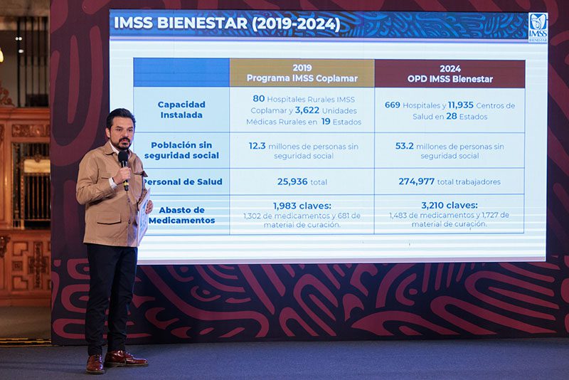 En conferencia de prensa matutina con el presidente Andrés Manuel López Obrador, el funcionario presentó un comparativo entre el modelo IMSS Coplamar en 2019 e IMSS Bienestar en 2024, presente en comunidades de Baja California, Baja California Sur, Campeche, Chiapas, Ciudad de México, Colima, Estado de México, Guerrero, Hidalgo, Michoacán, Morelos, Nayarit, Oaxaca, Puebla, Quintana Roo, San Luis Potosí, Sinaloa, Sonora, Tabasco, Tamaulipas, Tlaxcala, Veracruz y Zacatecas.